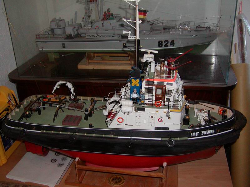 Hafen und Bergungsschlepper "SMIT SWEDEN" Maßstab 1:32 von Billing Boats mit zahlreichen Umbauten wie z.B. stärkere Antriebsanlage mit Zahnriemenantrieb