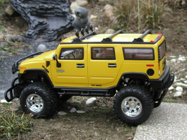 Die "Zugmaschine" für das Powerboat ist ein HUMMER H2 Modell aus den USA im gleichen Maßstab. Er wurde auf eine FM/40MHz Funkfernsteuerung umgebaut. Dazu bekam er ein anderes Servo, einen elektronischen Fahrtregler und das vorhandene Soundmodul und die Beleuchtung wurden integriert.