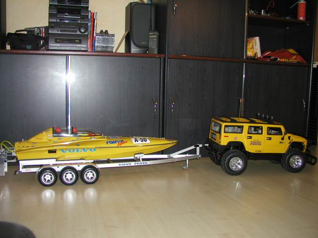 Die Hängerklaue und die Kupplung am HUMMER H2 sind fertig. Der HUMMER H2 wurde komplett umgebaut (davon später). FM/40MHz Funkfernsteuerung mit neuem Servo und elektronischem Fahrtregler. Original Sound und Beleuchtung integriert.